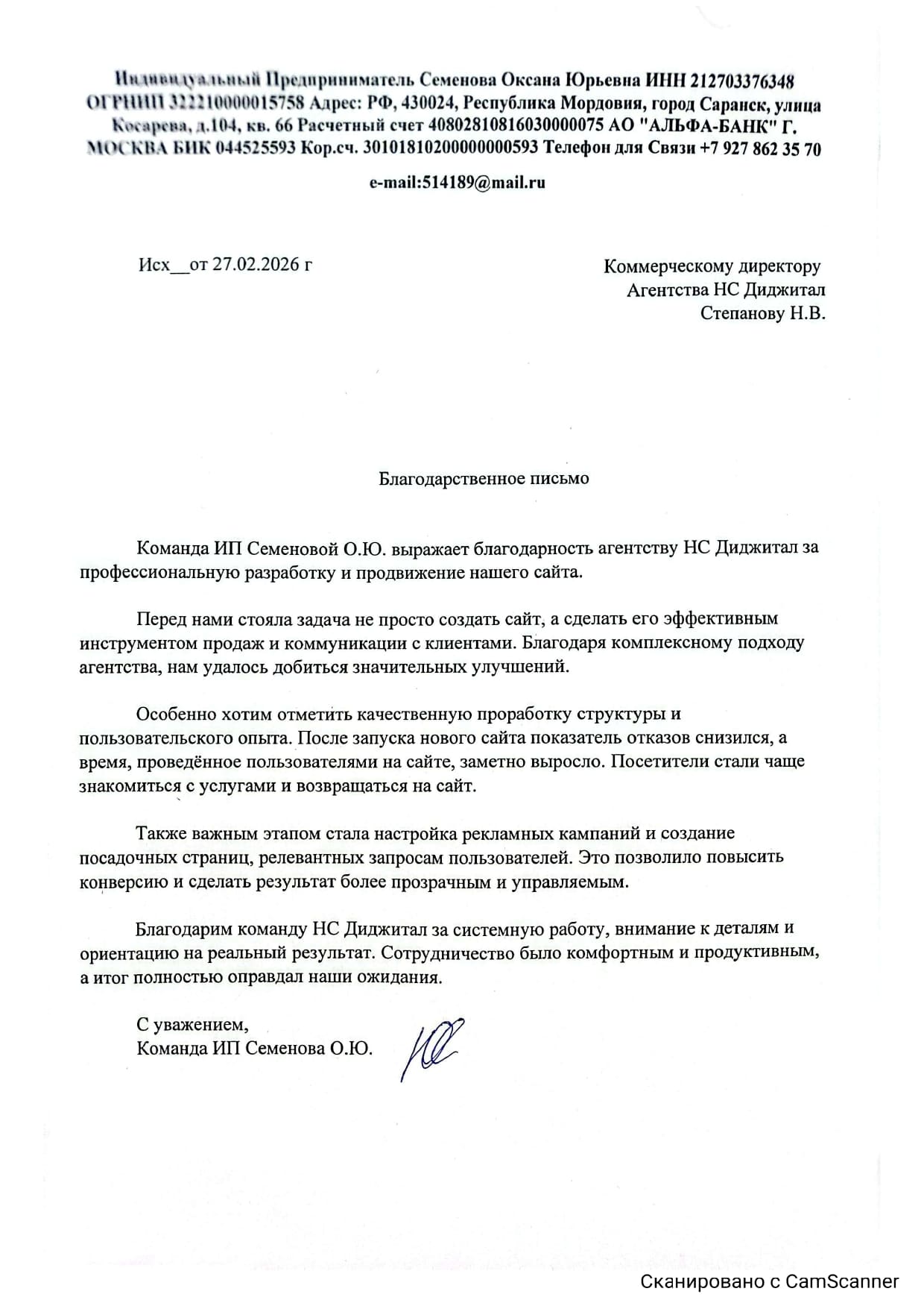 Благодарность компании ИП Семенова О.Ю.